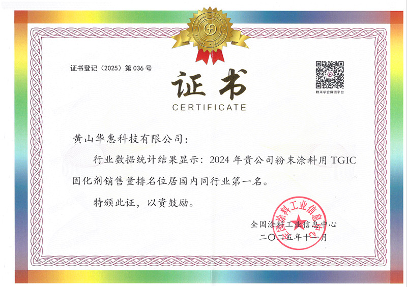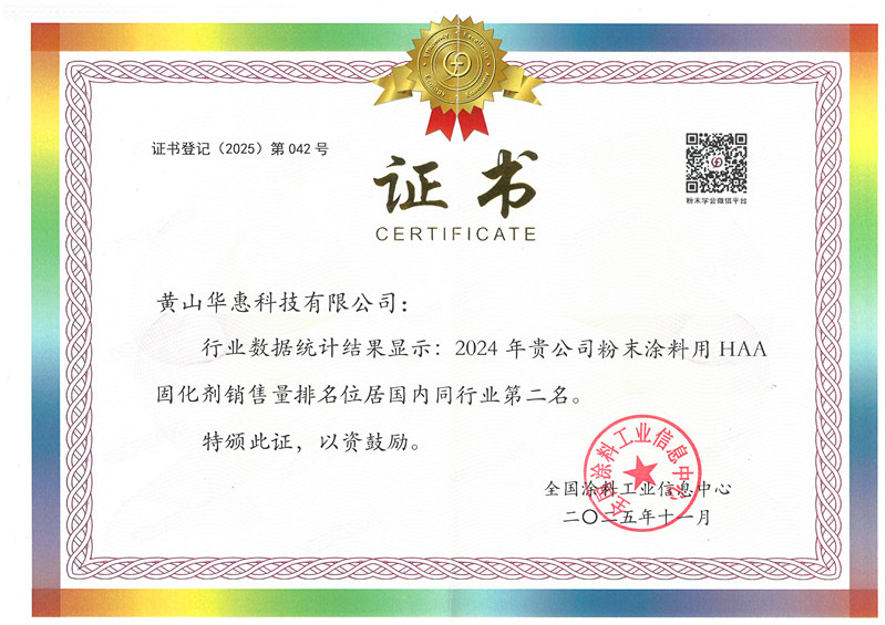 2025年11月4日,華惠科技2025粉末涂料與涂裝展在武漢國際博覽中心圓滿落下帷幕。展會上傳出喜訊,根據(jù)權(quán)威行業(yè)數(shù)據(jù),黃山華惠科技有限公司在2024年國內(nèi)粉末涂料用固化劑銷售中表現(xiàn)卓越,勇奪TGIC固化劑銷售量全國榜首,同時榮登HAA固化劑銷售量全國第二位,成功攬獲雙項殊榮。